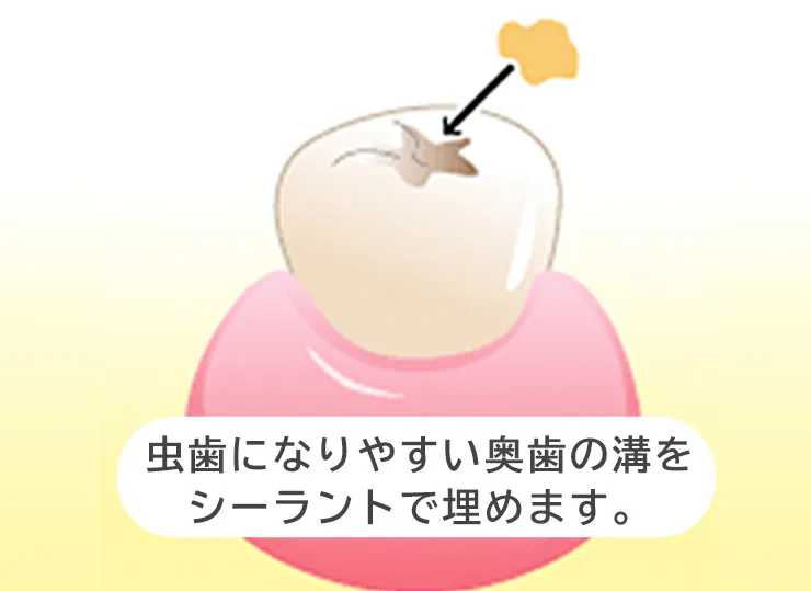 シーラントとは、奥歯の虫歯になりやすい歯の溝にプラスチックを埋め込み、虫歯を予防する方法です。歯を削ることがなく、回数も1回で済みますので、子供の虫歯予防に非常に効果的です。乳歯はもちろん、永久歯にも効果的です。