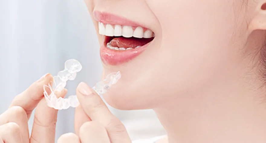 当院ではワイヤーを使用せず、痛みが少なく、目立たない歯列矯正「インビザライン」をおすすめしています。 インビザラインはマウスピースで矯正する治療法で、非常に薄く作られたマウスピースと歯の摩擦力によって歯列を矯正します。