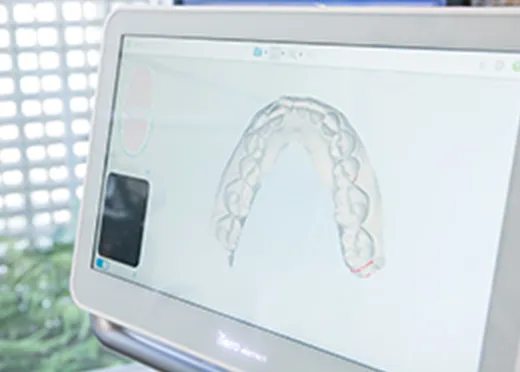 口腔内を直接3Dスキャナーでコンピューターに取り込むことで、精度の高いマウスピースが作製できるようになりました。さらに、3Dスキャンで取り込んだ画像をその場で確認できるので、治療シミュレーションを行いながら、最終的な歯並びへの治療計画を立てることができるようになりました。