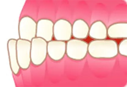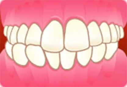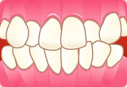 - 歯が重なり合い凸凹の状態。八重歯や乱ぐい歯ともいい、歯磨きが難しく虫歯や歯周病へのリスクが大きいです。